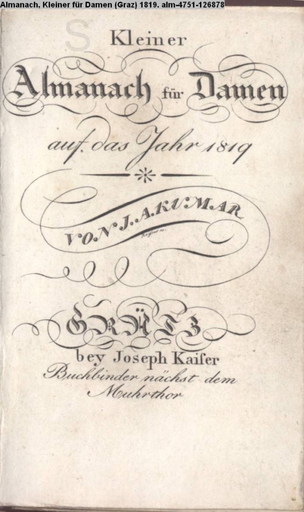 Kleiner / ALMANACH für DAMEN / auf das Jahr 1819. / Von J. A. KUMAR / GRÄTZ / Bey Joseph Kaiser / Buchbinder nächst dem / Muhrthor