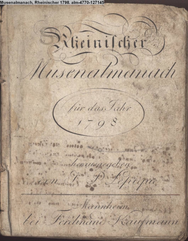 Rheinischer / Musenalmanach / für das Jahr / 1798 / herausgegeben / von J. P. Lepique / Mannheim / bei Ferdinand Kaufmann