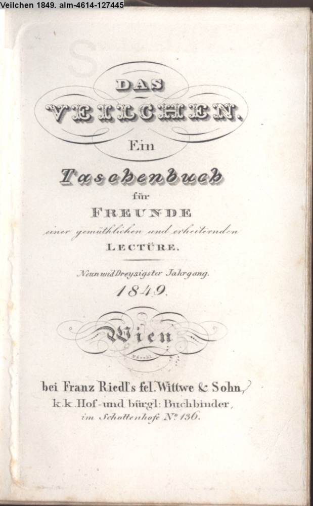 DAS / VEILCHEN. / Ein / Taschenbuch / für / FREUNDE / einer gemüthlichen und erheiternden / LECTÜRE. / Neun und dreißigster Jahrgang. / 1849. / Wien / bei Franz Riedl's sel. Wittwe & Sohn, / k.k. Hof- und bürgl. Buchbinder, / im Schottenhofe No 136