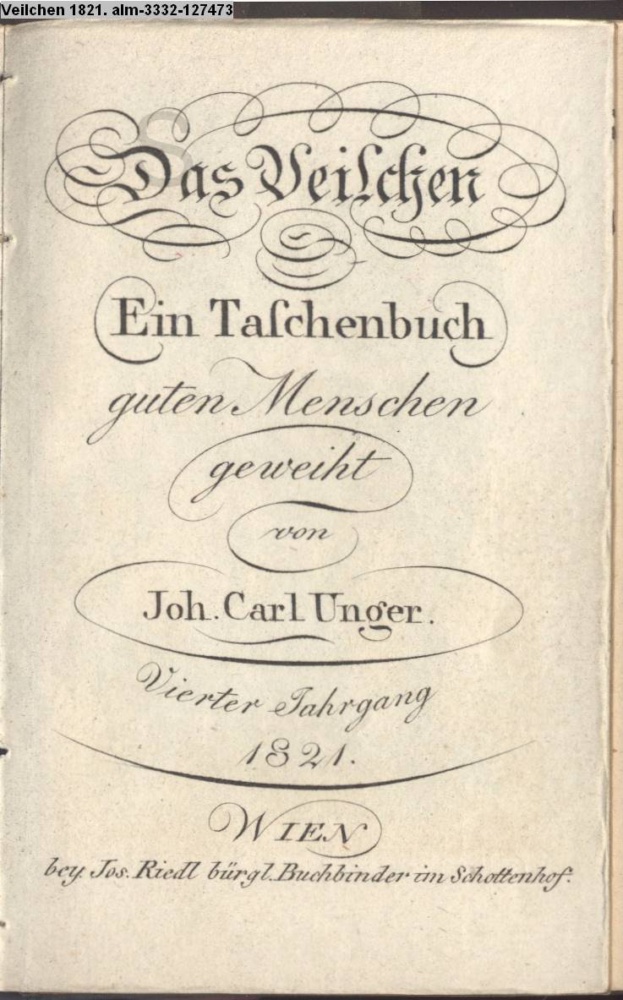 Das Veilchen / Ein Taschenbuch / guten Menschen / geweiht / von / Joh. Carl Unger. / Vierter Jahrgang / 1821. / WIEN / bey Jos Riedl bürgl. Buchbinder im Schottenhof