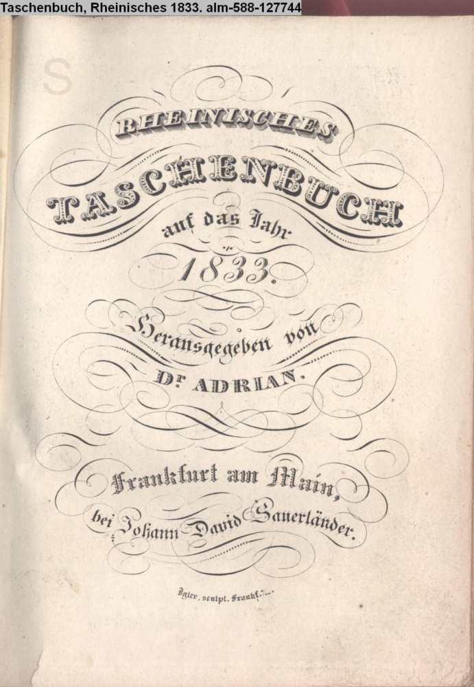 RHEINISCHES / TASCHENBUCH / auf das Jahr / 1833. / Herausgegeben von / Dr. ADRIAN. / Frankfurt am Main, / bei Johann David Sauerländer