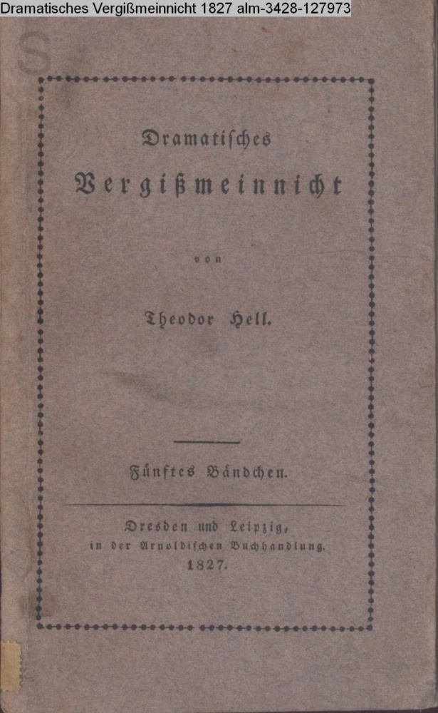Dramatisches / Vergißmeinnicht / aus / den Gärten des Auslandes nach Deutschland / verpflanzt / von / Theodor Hell. / Fünftes Bändchen. / Enthält: / Die Vernunftheirath. / Lustspiel in 2 Aufzügen. / Der Gesandte. / Lustspiel in einem Aufzuge. / Dresden und Leipzig, / in der Arnoldischen Buchhandlung. / 1827