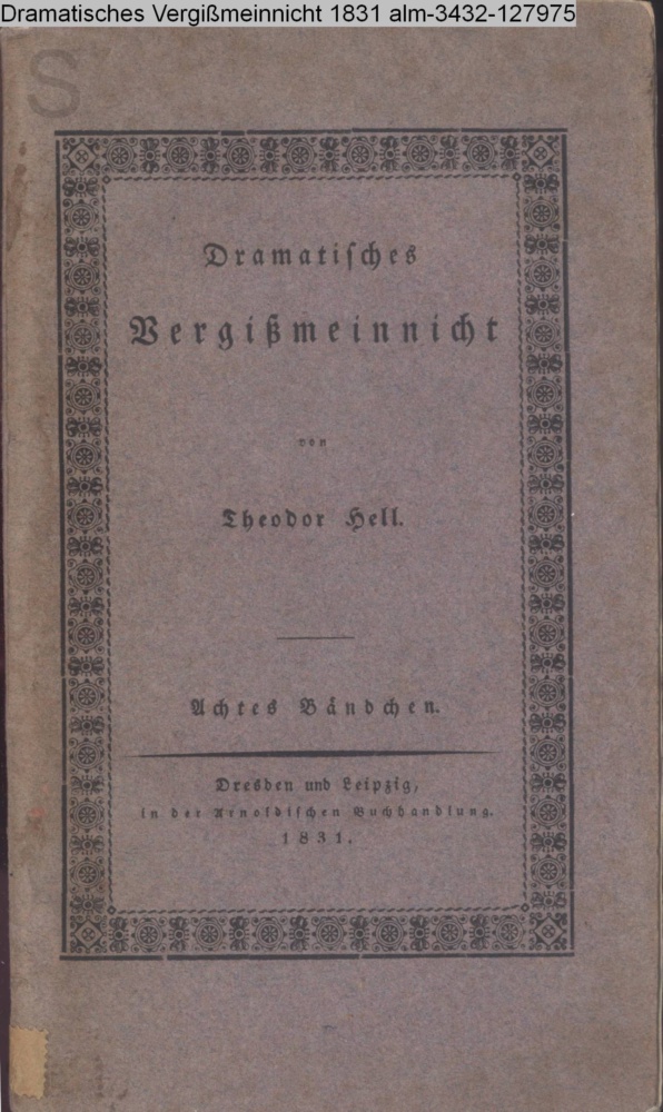 Dramatisches / Vergißmeinnicht / für das Jahr 1831 / aus / den Gärten des Auslandes nach Deutschland / verpflanzt / von / Theodor Hell. / Achtes Bändchen. / Enthält: / Die Königin von sechzehn Jahren. / Drama in zwei Aufzügen. / und / Der Enkel. / Schauspiel in einem Akt. / Dresden und Leipzig, / in der Arnoldischen Buchhandlung. / 1831