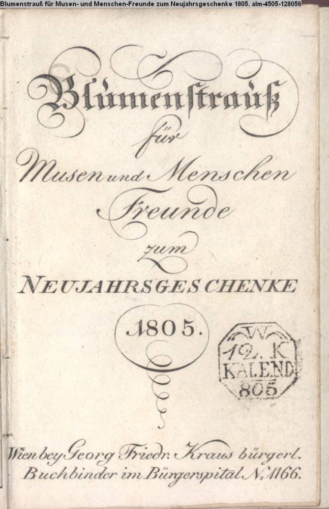 Blumenstrauß / für / Musen und Menschen / Freunde / zum / NEUJAHRSGESCHENKE / 1805. / Wien bey Georg Friedr. Kraus bürgerl. / Buchbinder im Bürgerspital No 1166