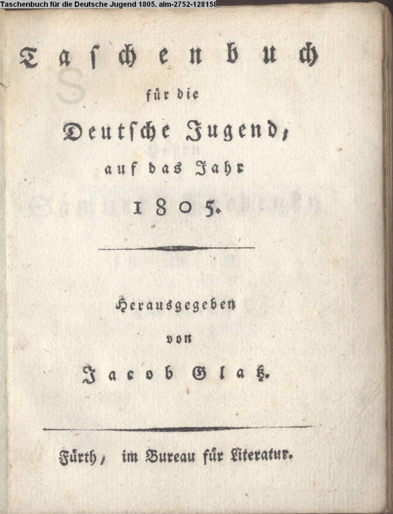 Taschenbuch / für die / Deutsche Jugend, / auf das Jahr / 1805. / Herausgegeben / von / Jakob Glatz. / Fürth, im Bureau für Literatur