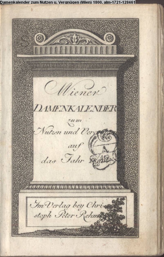 Wiener / DAMENKALENDER / zum / Nutzen u. Vergnügen / auf / das Jahr 1800. / Im Verlag bey Chri- / stoph Peter Rehm