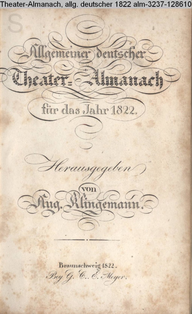 Allgemeiner deutscher / Theater- Almanach / für das Jahr 1822. / Herausgegeben / von / Aug. Klingemann. / Braunschweig 1822. / Bey G. C. E. Meyer