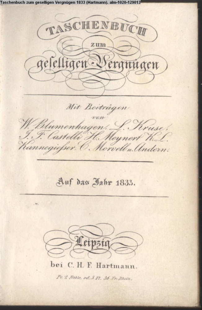 TASCHENBUCH / zum / geselligen Vergnügen / Mit Beiträgen / von / W. Blumenhagen, L. Kruse, / I. F. Castelli, H. Meynert, K. L. / Kannegießer, C. Morvell u. Andern. / Auf das Jahr 1833. / Leipzig / bei C. H. F. Hartmann. / Pr. 2 Rthlr. od. 3 Fl. 36 Kr. Rhein
