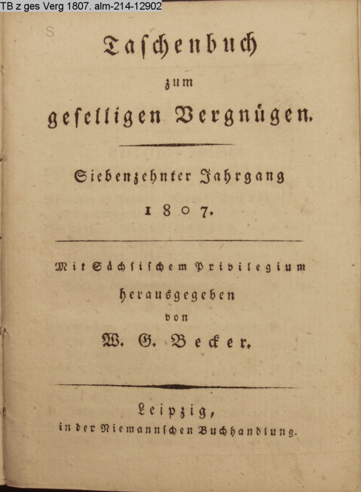 Taschenbuch / zum / geselligen Vergnügen / Siebenzehnter Jahrgang / 1807. / Mit Sächsischem Privilegium / herausgegeben / von / W. G. Becker. / Leipzig, / in der Niemannschen Buchhandlung