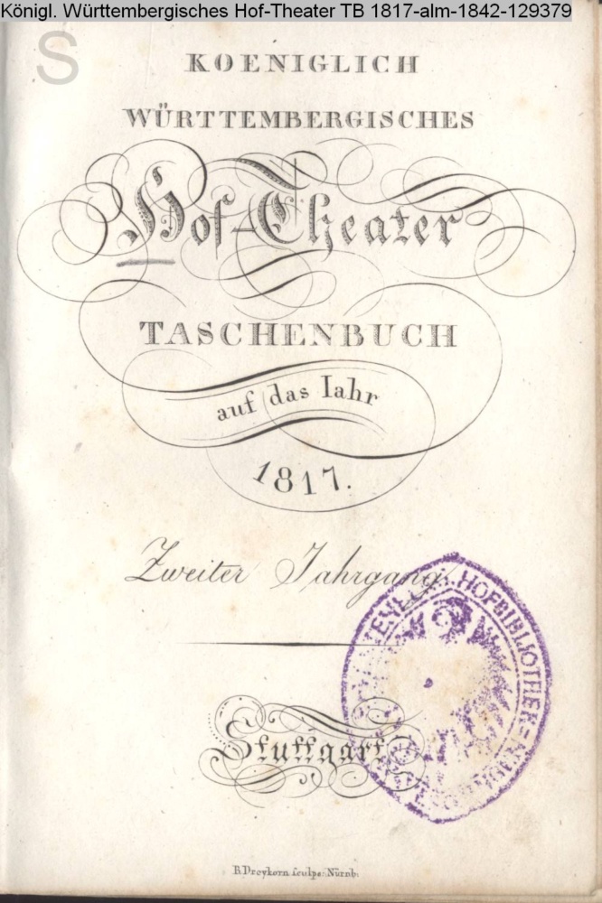KOENIGLICH / WÜRTTEMBERGISCHES / Hof-Theater / TASCHENBUCH / auf das Jahr / 1817. / Zweiter Jahrgang. / Stuttgart / R Dreykorn sculps. Nürnb.