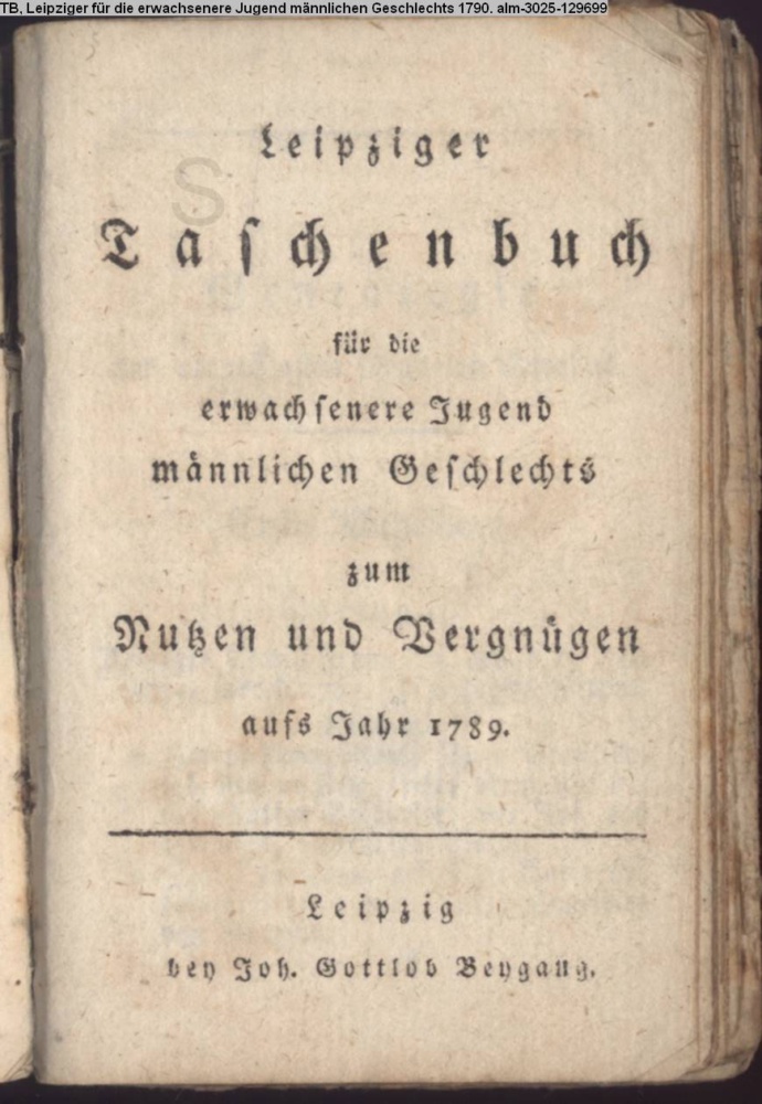 Leipziger / Taschenbuch / für die / erwachsenere Jugend / männlichen Geschlechts / zum / Nutzen und Vergnügen / aufs Jahr 1789. / Leipzig, / bey Joh. Gottlob Beygang