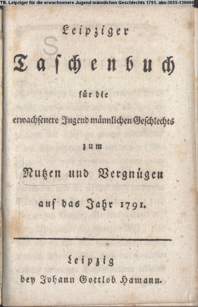 Leipziger / Taschenbuch / für die / erwachsenere Jugend männlichen Geschlechts / zum / Nutzen und Vergnügen / aufs Jahr 1791. / Leipzig, / bey Johann Gottlob Hamann
