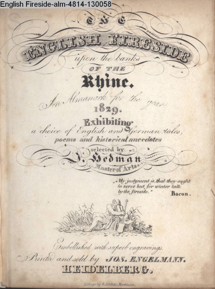The / ENGLISH FIRESIDE / upon the banks / OF THE / Rhine / An Almanack for the year / 1829. / Exhibiting / a choice of English and German Tales, / poems and historical anecdotes / selected by / J. Hedman / »My judgment is, that they ought / to serve but for winter talk / by the fireside.“ / Bacon. / Embellished with superb engravings. / Printed and sold by JOS. ENGELMANN. / HEIDELBERG. / Lithogr. by R. Schlicht, Mannheim