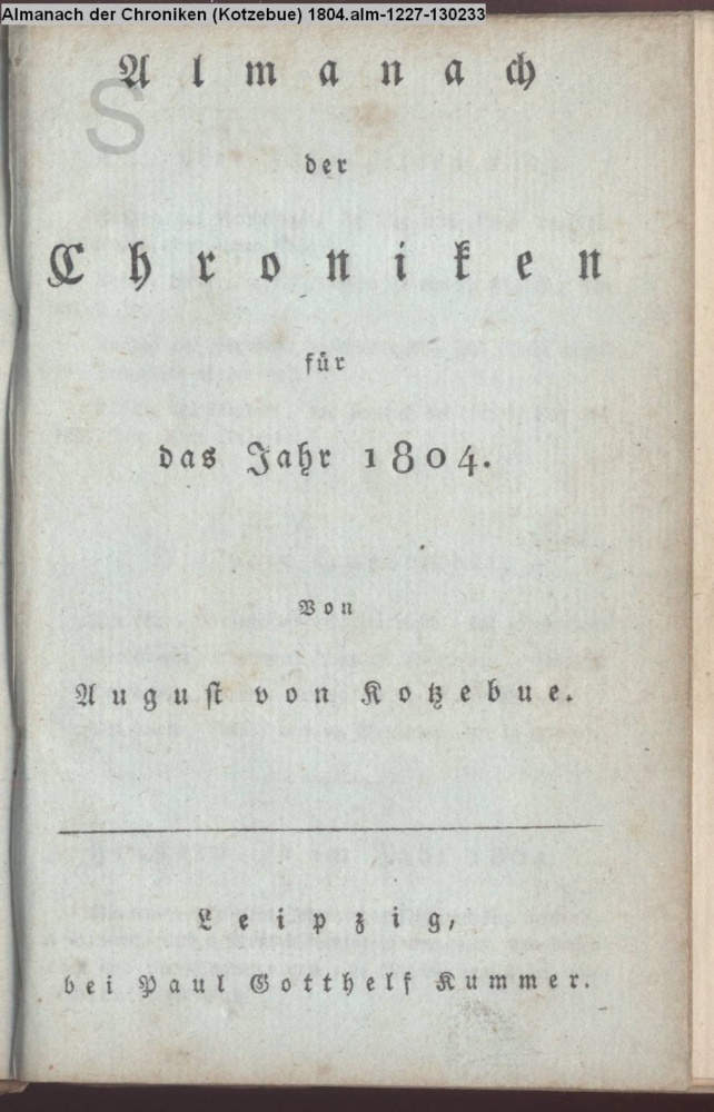 Almanach / der / Chroniken / für / das Jahr 1804. / Von / August von Kotzebue. / Leipzig, / bei Paul Gotthelf Kummer.