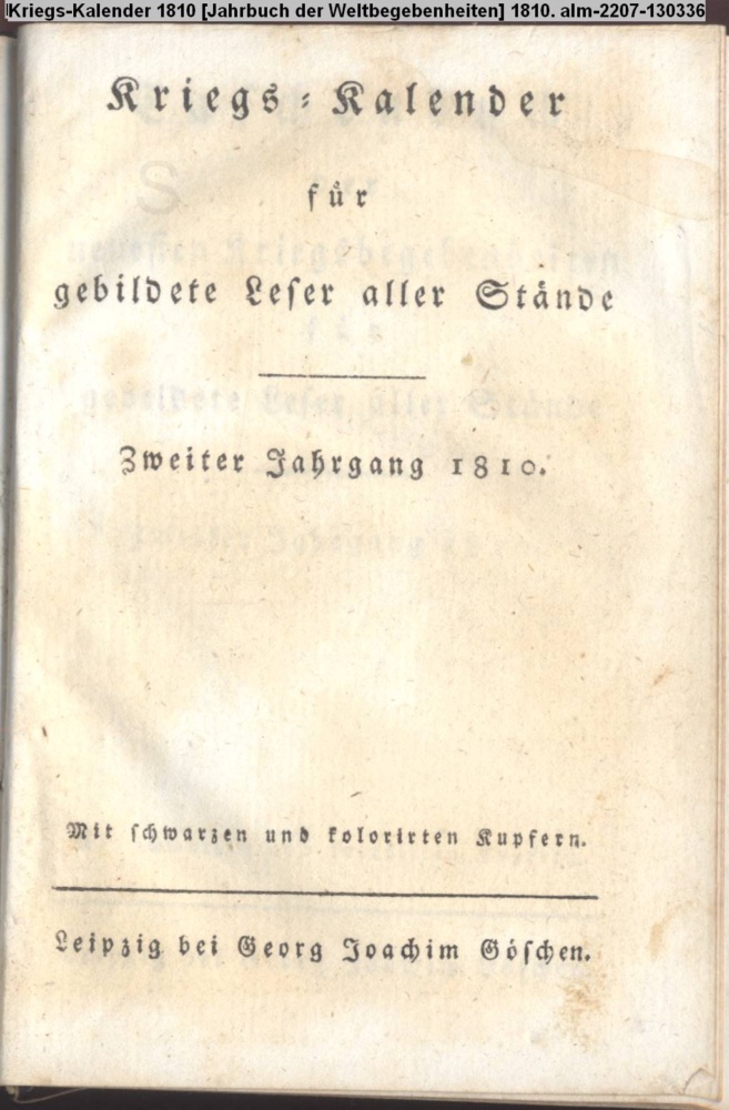 Kriegs-Kalender / für / gebildete Leser aller Stände / Zweiter Jahrgang 1810. / Mit schwarzen und kolorierten Kupfern / Leipzig bei Georg Joachim Göschen