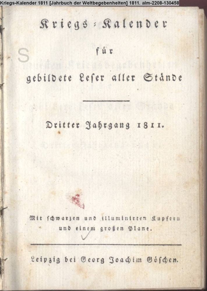 Taschenbuch / der / neuesten Kriegsbegebenheiten / für / gebildete Leser aller Stände. / Dritter Jahrgang 1811. / Mit schwarzen und illuminierten Kupfern / und einem großen Plane. / Leipzig bei Georg Joachim Göschen