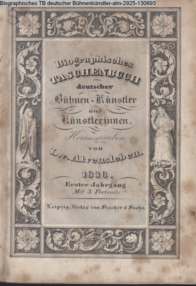 Biographisches / Taschenbuch / deutscher / Bühnen-Künstler / und / Künstlerinnen / Herausgegeben / von / L. v. Alvensleben. / 1836. / Erster Jahrgang / Mit 3 Portraits / Leipzig, Verlag von Fischer & Fuchs