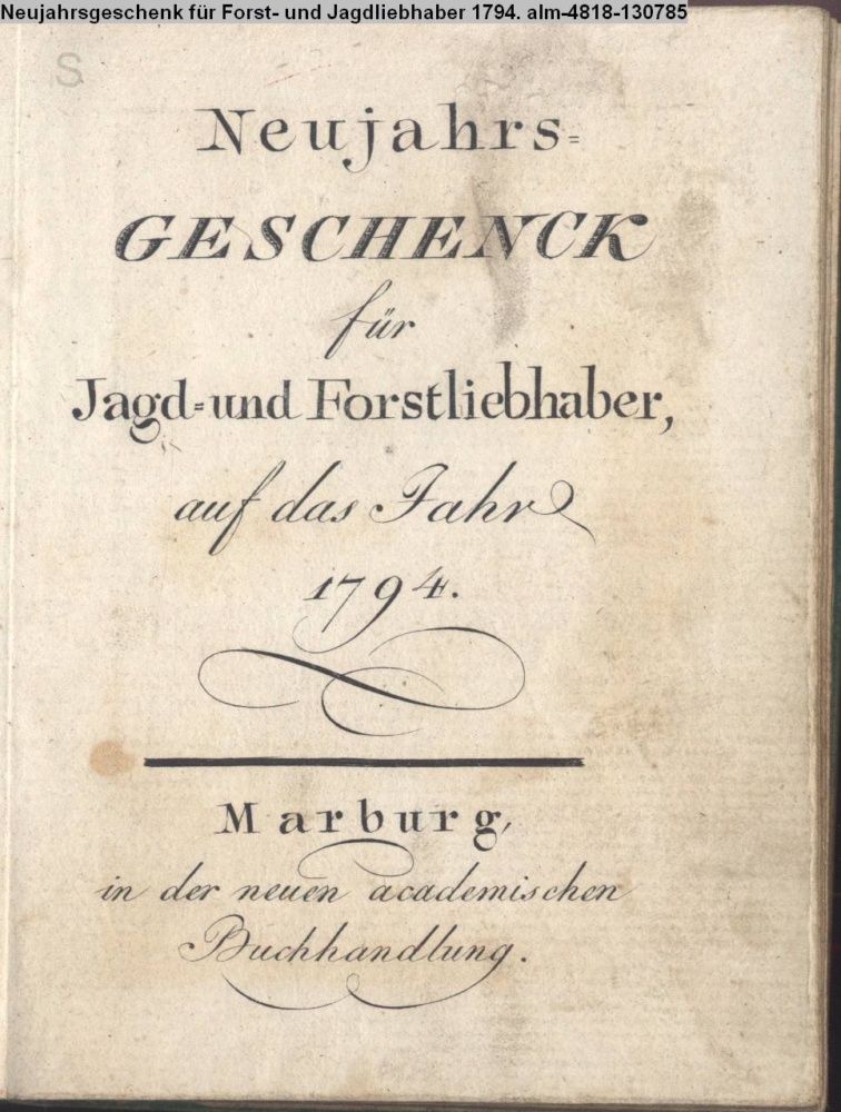 NEUJAHRS- / GESCHENCK / für / Jagd- und Forstliebhaber, / auf das Jahr / 1794. / Marburg, / in der neuen academischen / Buchhandlung