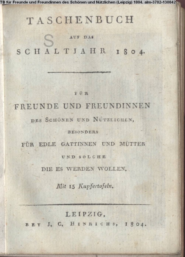 TASCHENBUCH / AUF DAS / SCHALTJAHR 1804. / FÜR / FREUNDE UND FREUNDINNEN / DES SCHÖNEN UND NÜTZLICHEN, / BESONDERS / FÜR EDLE GATTINNEN UND MÜTTER / UND SOLCHE / DIE ES WERDEN WOLLEN. / MIT 15 Kupfertafeln. / LEIPZIG, / BEY J. C. HINRICHS, 1804