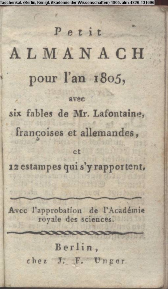 Petit / ALMANACH / pour l'an 1805, / avec / six fables de Mr. Lafontaine, / françoises et allemandes, / et / 12 estampes qui s'y rapportent. / Avec l'approbation de l' Académie / royale des sciences. / Berlin, / chez J. F. Unger