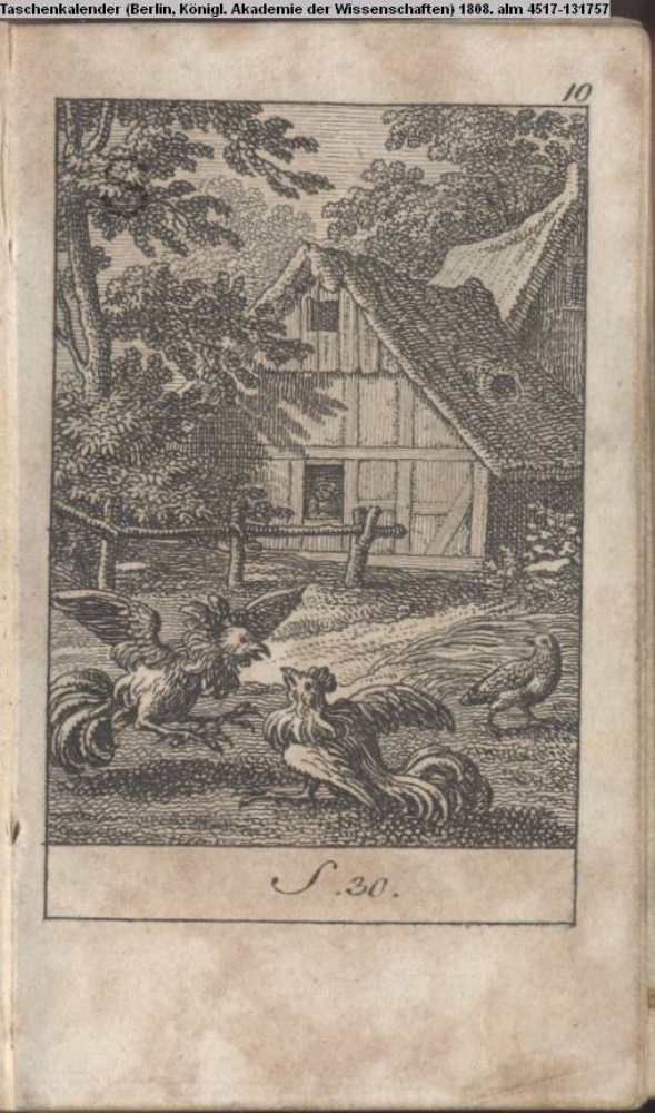 Illustration zu »Das Rebhuhn und die Hähne« von La Fontaine
