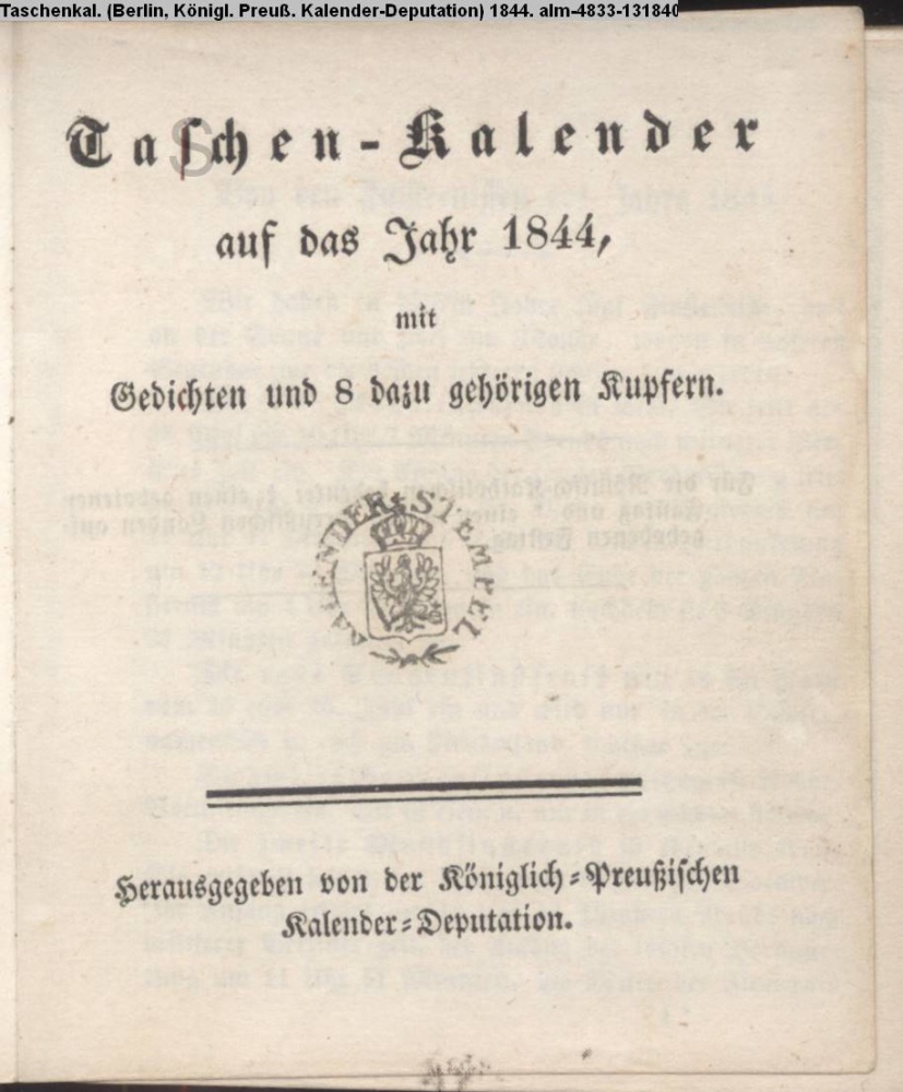 Taschen-Kalender / auf das Jahr 1844, / mit / Gedichten und 8 dazu gehörigen Kupfern / Herausgegeben von der Königlich-Preußischen / Kalender-Deputation