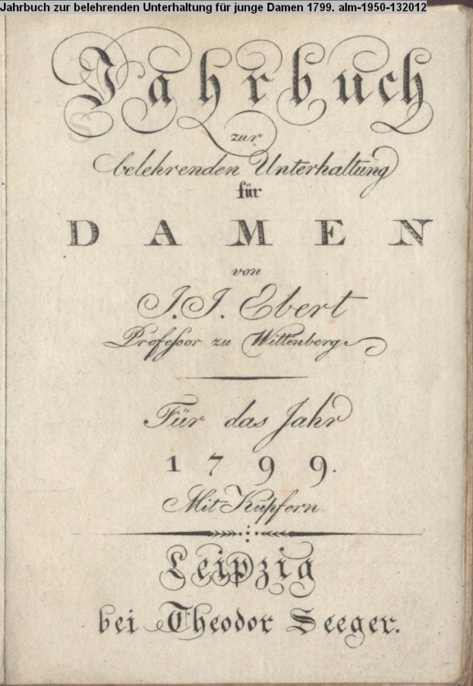Jahrbuch / zur / belehrenden Unterhaltung / für / DAMEN / von / J. J. Ebert / Professor zu Wittenberg. / Für / das Jahr 1799. / Mit Kupfern. / Leipzig / bei Theodor Seeger