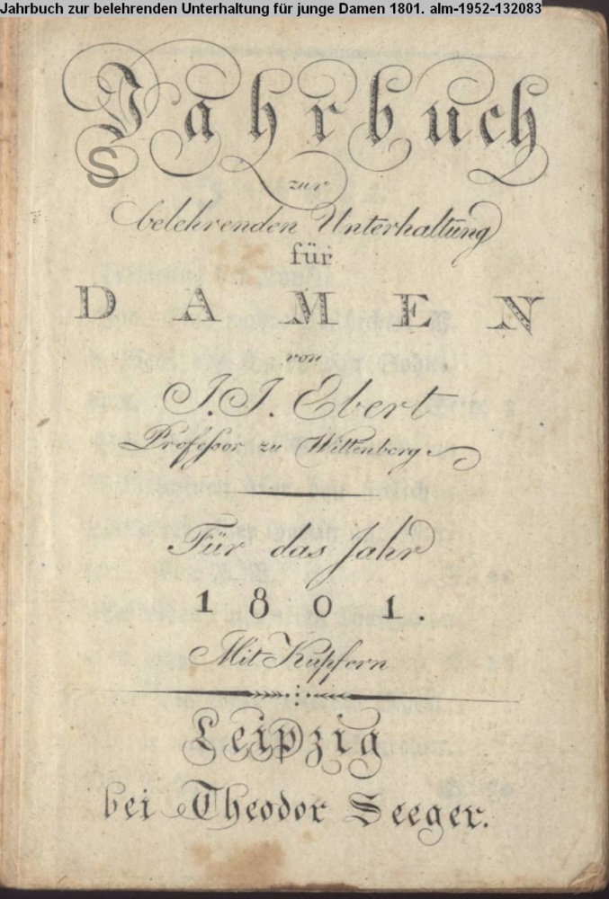 Jahrbuch / zur / belehrenden Unterhaltung / für / DAMEN / von / J. J. Ebert / Professor zur Wittenberg / Für das Jahr / 1801. / Mit Kupfern / Leipzig / bei Theodor Seeger
