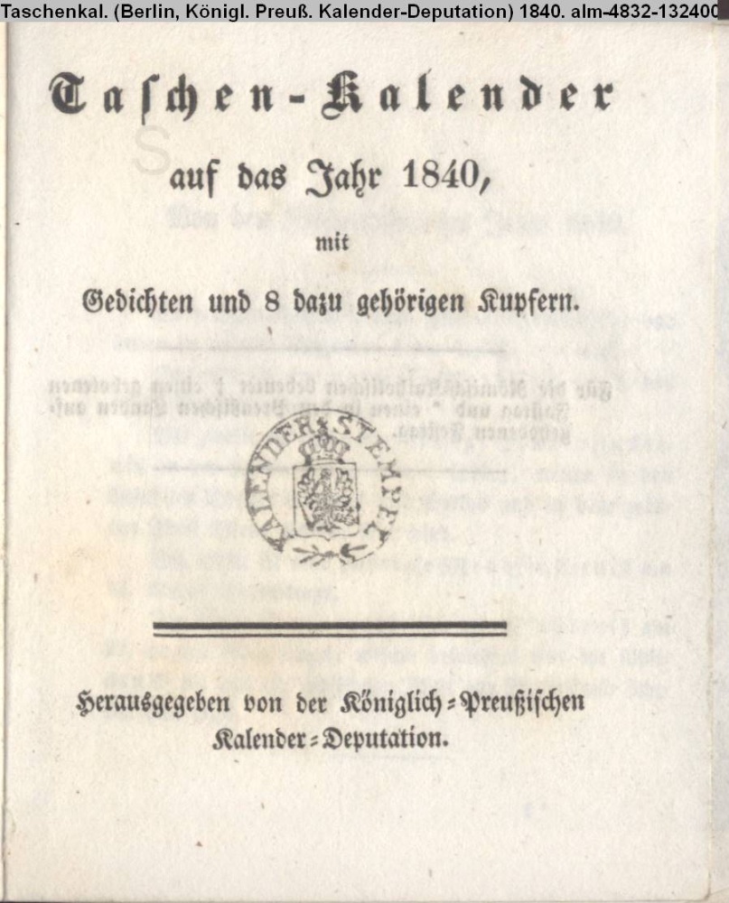 Taschen-Kalender / auf das Jahr 1840, / mit Gedichten und 8 dazu gehörigen Kupfern. / Herausgegeben von der Königlich-Preußischen / Kalender-Deputation