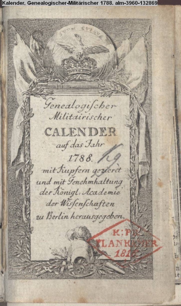 Genealogischer / Militairischer / CALENDER / auf das Jahr / 1788. / mit Kupfern gezieret / und mit Genehmhaltung / der Königl. Academie / der Wissenschaften / zu Berlin herausgegeben