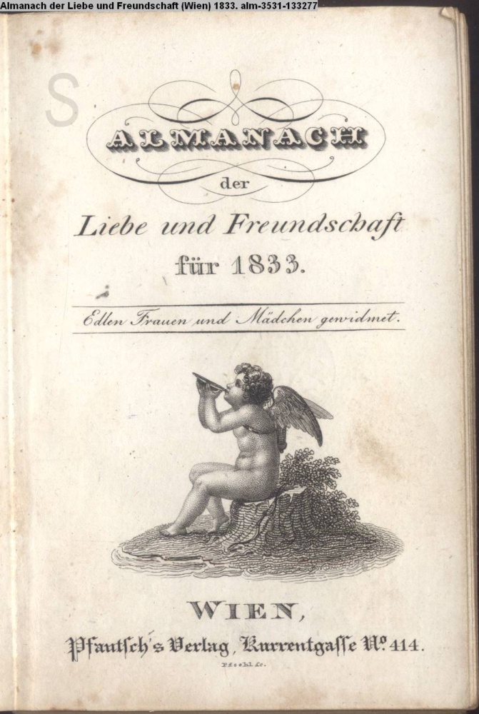 ALMANACH / der / Liebe und Freundschaft / für 1833. / Edlen Frauen und Mädchen gewidmet. / WIEN / Pfautsch's Verlag, Kurrentgasse No. 414
