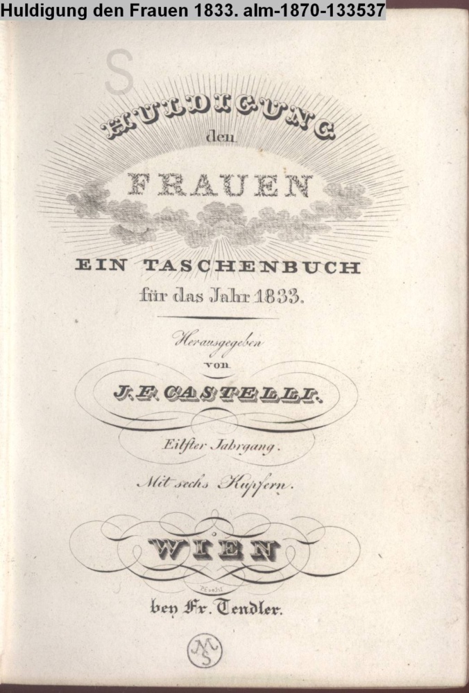 HULDIGUNG / den / FRAUEN / EIN TASCHENBUCH / für das Jahr 1833. / Herausgegeben / von / I. F. CASTELLI. / Zehnter Jahrgang. / Mit sechs Kupfern. / WIEN / bey Fr. Tendler