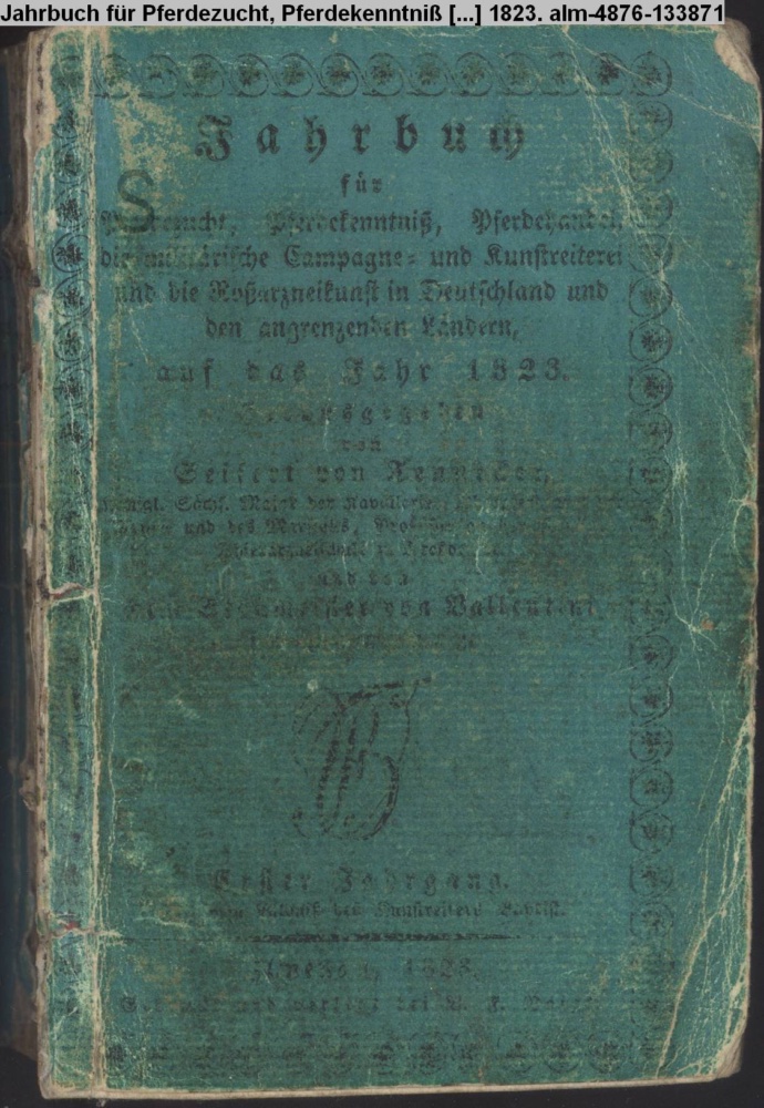 Jahrbuch / für / Pferdezucht, Pferdekenntniß, Pferdehandel, / der militärischen Campagne- und Kunstreiterei / und die Roßarzneikunst in Deutschland und / den angränzenden Ländern, / auf das Jahr 1823. / Herausgegeben / von / Seifert von Tennecker, [...] und von / dem Stallmeister von Vallentini / in Hamburg. / Erster Jahrgang. / Mit dem Bildniß des Kunstreiters Baptist. / Ilmenau, 183. / Gedruckt und verlegt bei B. F. Voigt