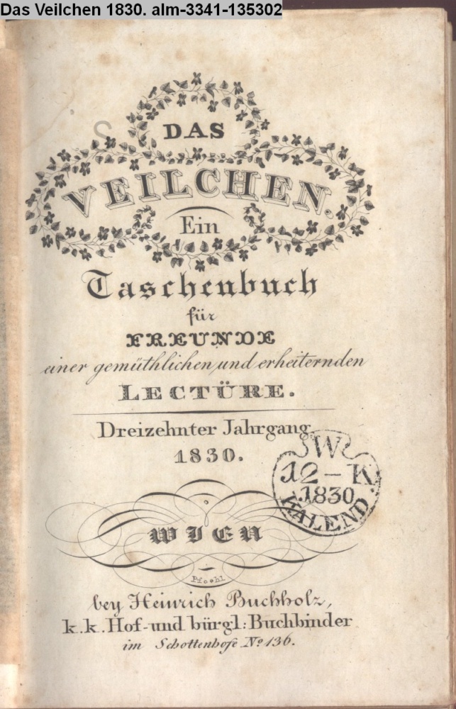 DAS / VEILCHEN. / Ein TASCHENBUCH / für / FREUNDE / einer gemüthlichen und erheiternden / LECTÜRE. / Dreizehnter Jahrgang. / 1830. / WIEN / bey Heinrich Buchholz, / k.k. Hof- und bürgl. Buchbinder / im Schottenhofe No. 136
