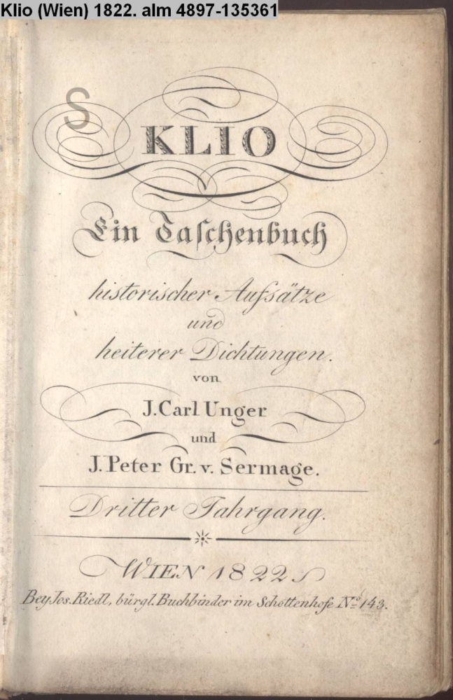 KLIO / Ein Taschenbuch / historischer Aufsätze / und / heiterer Dichtungen / von J. Carl Unger / und J. Peter Gr. v. Sermage. / Dritter Jahrgang / WIEN 1822. / Bey Jos. Riedl, bürgl. Buchbinder im Schottenhofe No.143