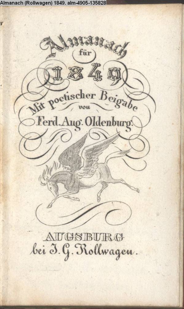 Almanach / für / 1849. / Mit poetischer Beigabe / von / Ferd. Aug. Oldenburg. / Augsburg, / bei J. G. Rollwagen / in der Carolinen-Straße