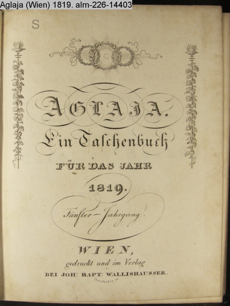 AGLAJA. / Ein Taschenbuch / FÜR DAS JAHR 1819. / Fünfter Jahrgang. / WIEN, / gedruckt und im Verlage / BEI JOH. BAPT. WALLISHAUSSER.