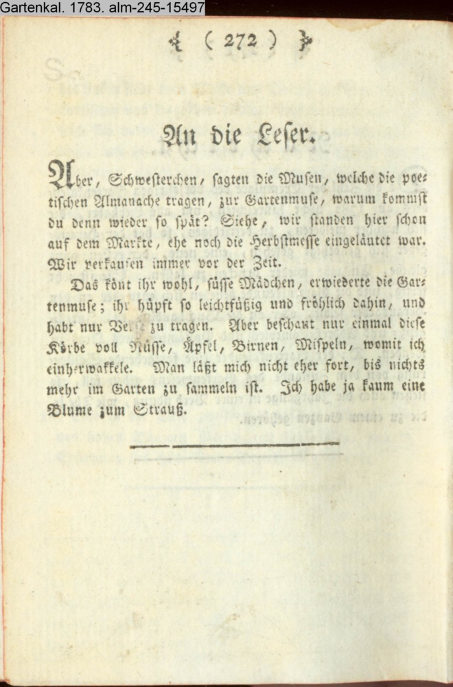 Aber, Schwesterchen, sagten die Musen, welche die poetischen Almanache tragen, zur Gartenmuse, warum kommst du denn wieder so spät?…