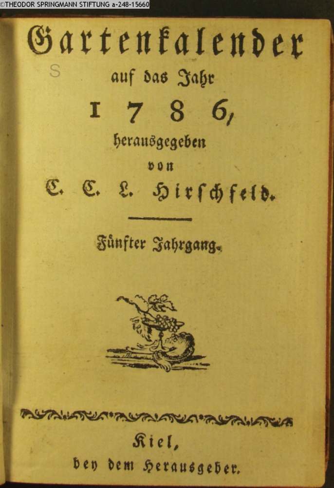 Gartenkalender / auf das Jahr / 1786, / herausgegeben / von / C. C. L. Hirschfeld. / Fünfter Jahrgang. / Kiel, bey dem Herausgeber