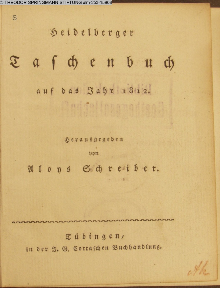 Heidelberger / Taschenbuch / auf das Jahr 1812. / Herausgegeben / von / Aloys Schreiber. / Tübingen, / in der J. G. Cottaschen Buchhandlung