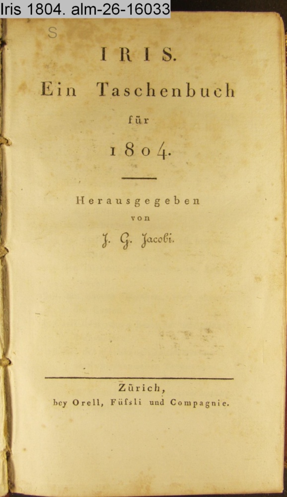 IRIS. / Ein Taschenbuch / für / 1804. / Herausgegeben / von / J. G. Jacobi. / Zürich, / bey Orell, Füssli und Compagnie