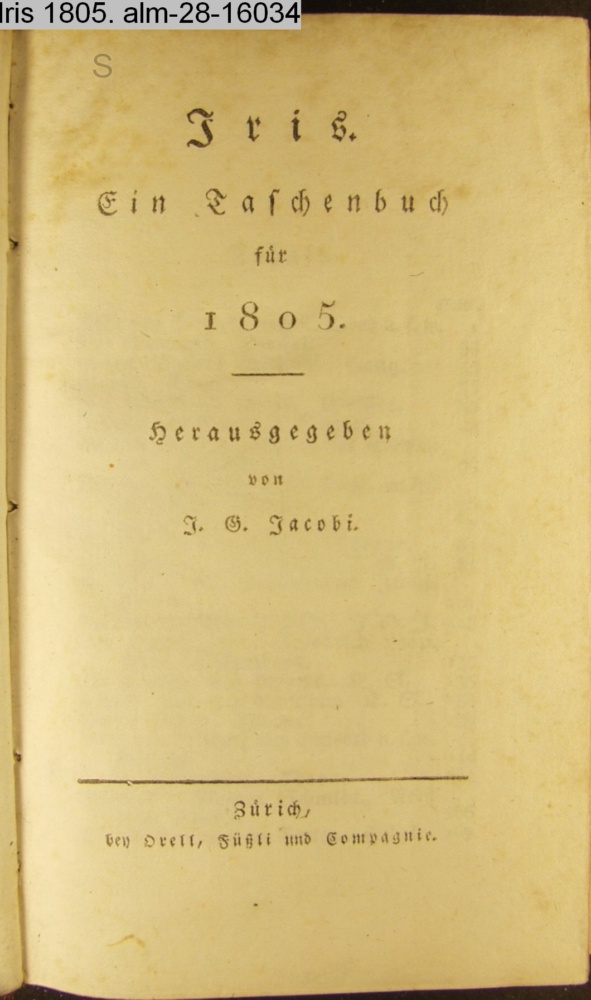 Iris. / Ein Taschenbuch / für / 1805. / Herausgegeben / von / J. G. Jacobi. / Zürich, / bey Orell, Füßli und Compagnie