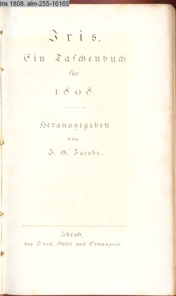 Iris. / Ein Taschenbuch / für / 1808. / Herausgegeben / von / J. G. Jacobi. / Zürich, / bey Orell, Füßli und Compagnie