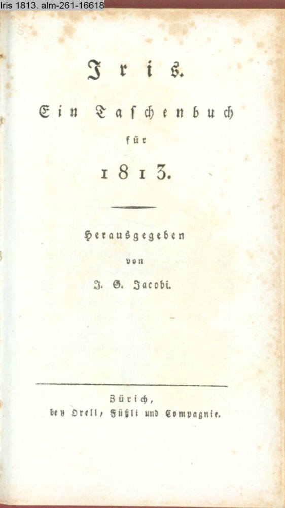 Iris. / Ein Taschenbuch / für / 1813. / Herausgegeben / von / J. G. Jacobi. / Zürich, / bey Orell, Füßli und Compagnie