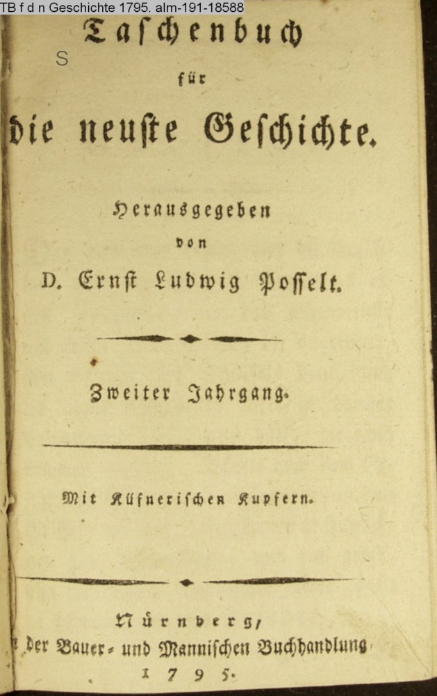 Taschenbuch / für / die neuste Geschichte / Herausgegeben / von D. Ernst Ludwig Posselt. / Zweiter Jahrgang. / mit Küfnerischen Kupfern. / Nürnberg, / in der Bauer- und Mannischen Buchhandlung, / 1795