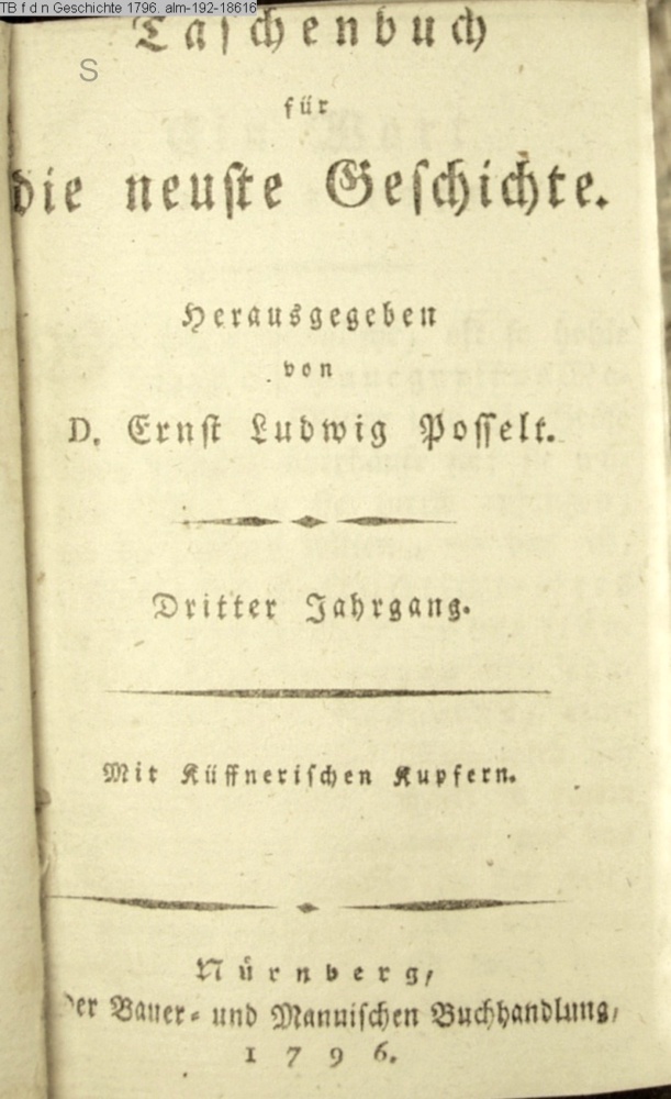 Taschenbuch / für / die neuste Geschichte. / Herausgegeben / von D. Ernst Ludwig Posselt. / Dritter Jahrgang. / mit Küffnerischen Kupfern. / Nürnberg, / in der Bauer- und Mannischen Buchhandlung. / 1796