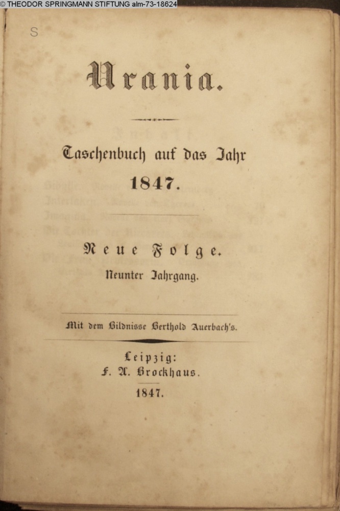 Urania. / Taschenbuch auf das Jahr / 1847. / Neue Folge. / Neunter Jahrgang. / Mit dem Bildnisse Bertold Auerbach's / Leipzig: / F. A. Brockhaus. / 1847