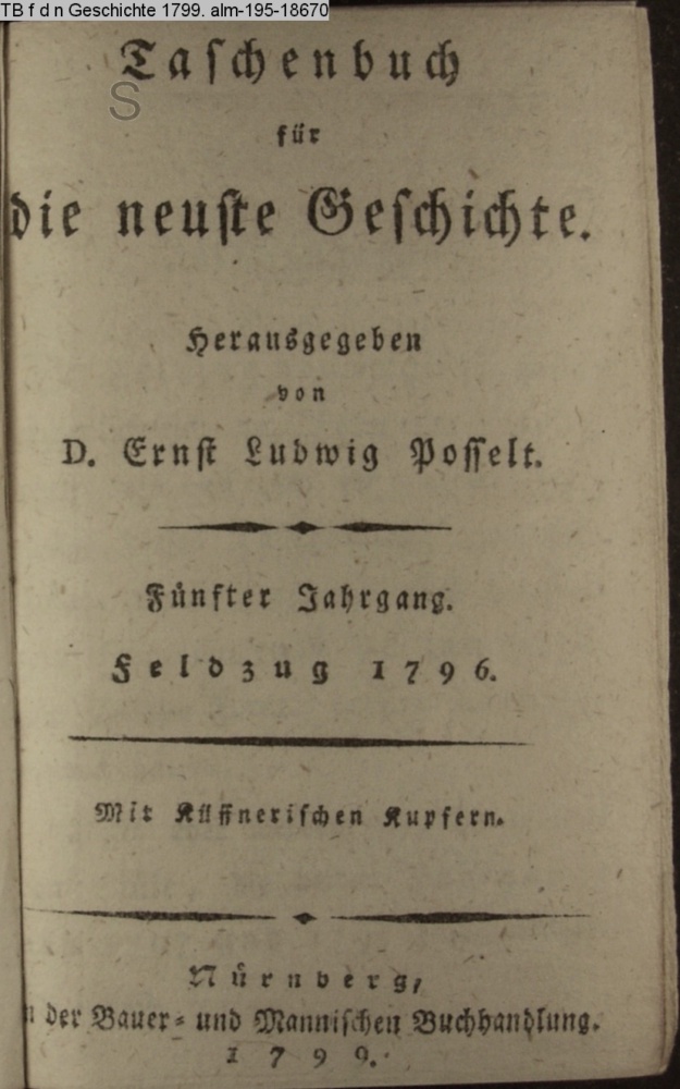 Taschenbuch / für / die neuste Geschichte. / Herausgegeben / von / D. Ernst Ludwig Posselt. / Fünfter Jahrgang. / Feldzug 1796. / Mit Küffnerischen Kupfern. / Nürnberg, / in der Bauer- und Mannischen Buchhandlung / 1799