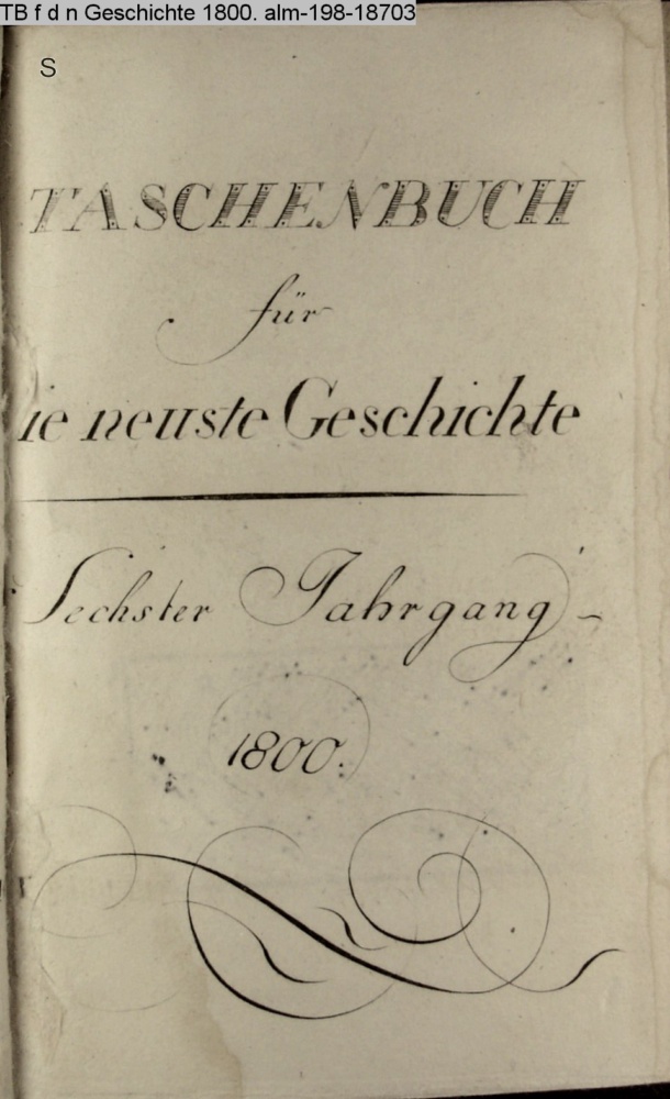 Taschenbuch / für / die neuste Geschichte. / Herausgegeben / von / D. Ernst Ludwig Posselt. / Sechster Jahrgang. / Mit Küffnerischen Kupfern. / Nürnberg / in der Bauer- und Mannischen Buchhandlung / 1800