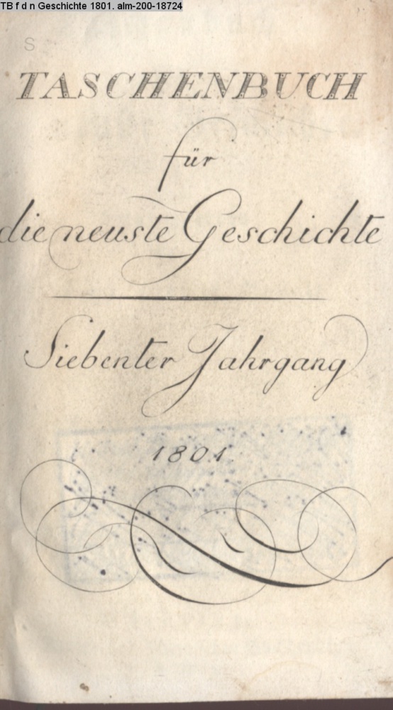Taschenbuch / für / die neuste Geschichte. / Herausgegeben / von / D. Ernst Ludwig Posselt. / Siebenter Jahrgang. / Mit Küffnerischen Kupfern. / Nürnberg, / in der Bauer- und Mannischen Buchhandlung. / 1801